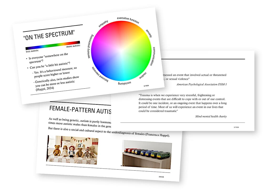 Suitable for anyone who works with “mild” autism (used to be known as Asperger’s Syndrome), whether that’s autistic clients, service users, colleagues, friends or family members. This session does not cover working with autistic children, nor medium and high support needs – it’s specifically about “covert” autism of the type which often isn’t diagnosed until adulthood.